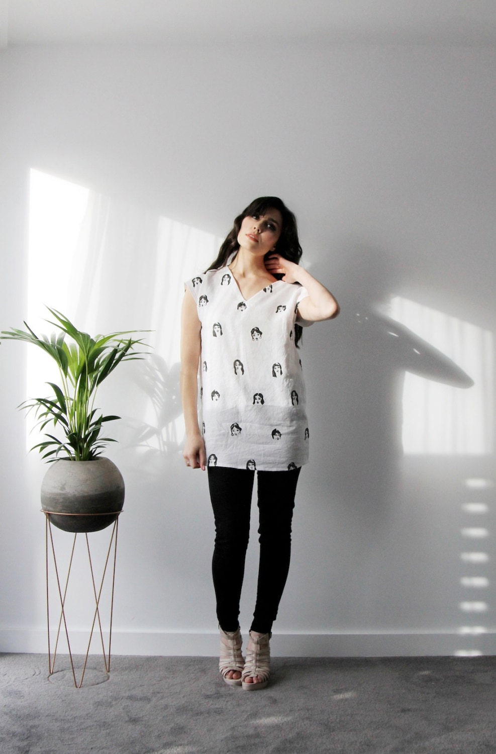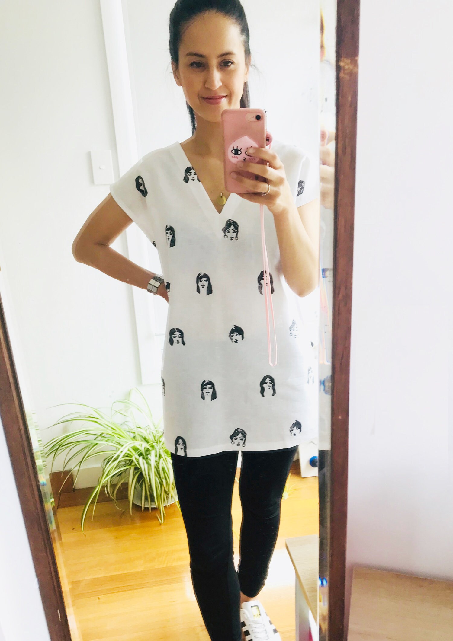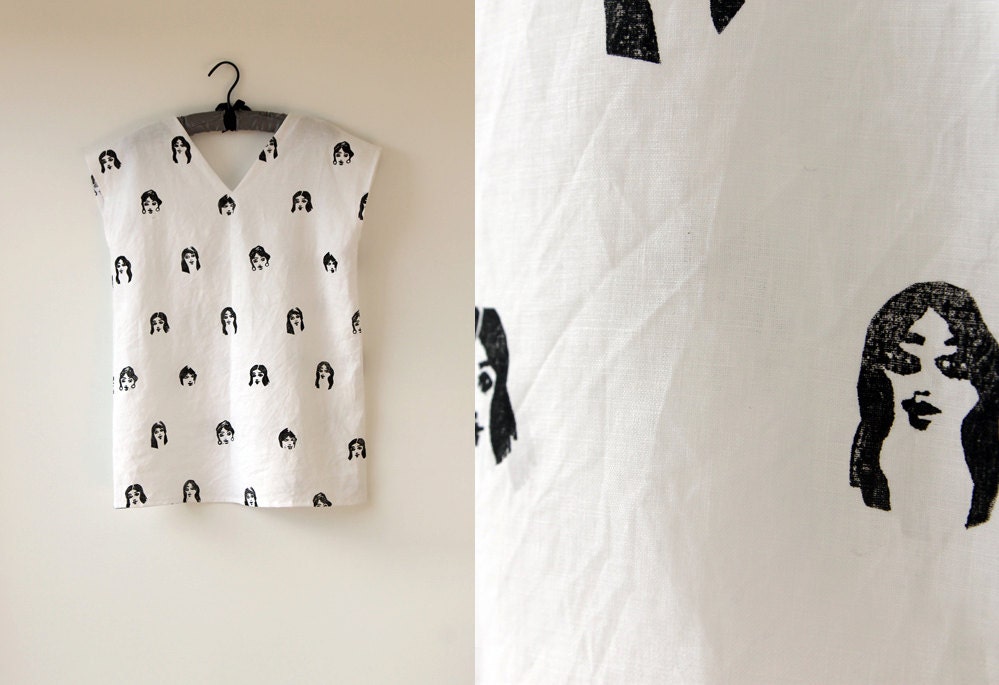Hand stamped using five blocks each carved with their own little lady. In each top they appear in a different order - all completely random - and who doesn't love a bit of random in their lives! :)