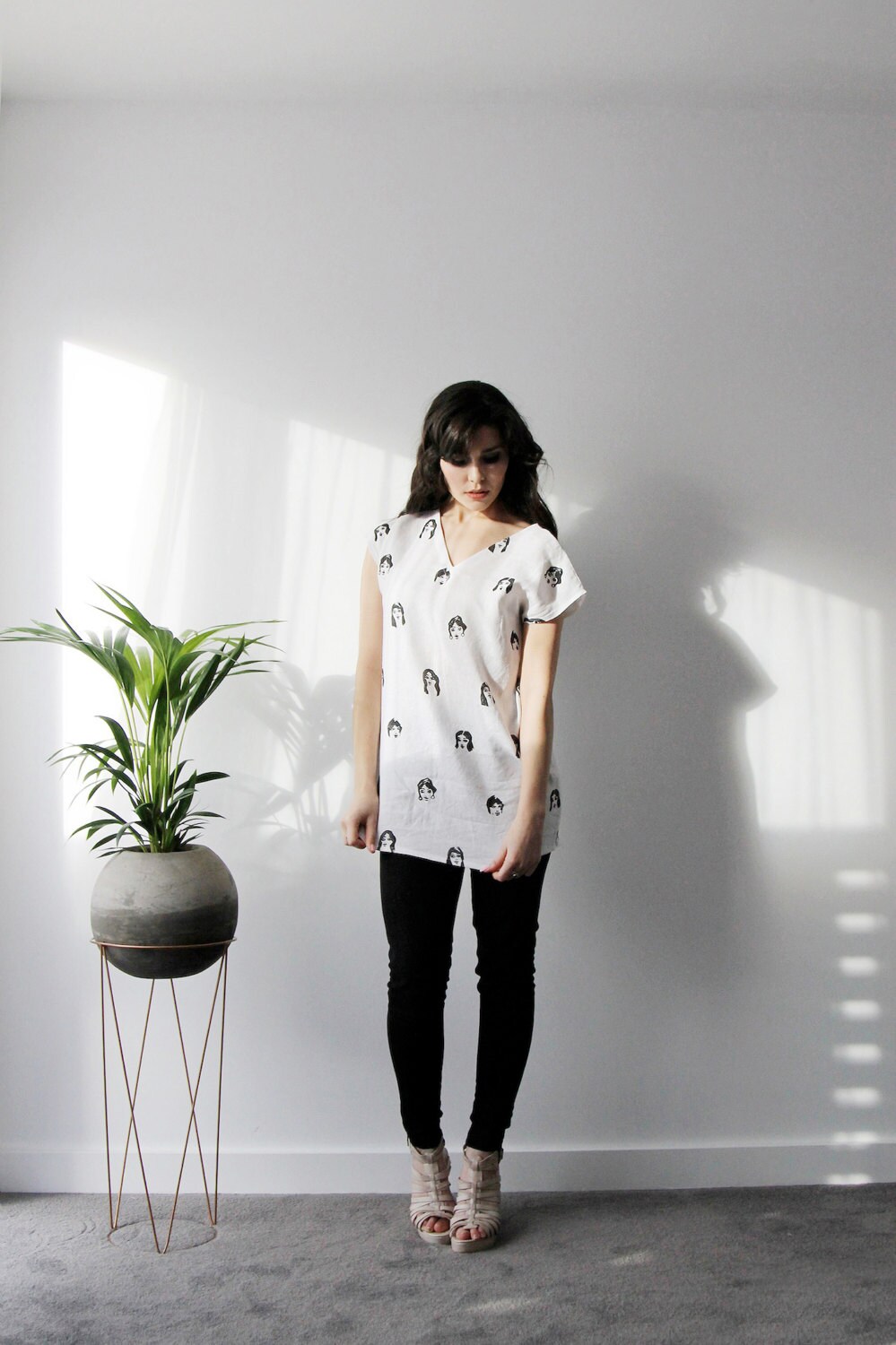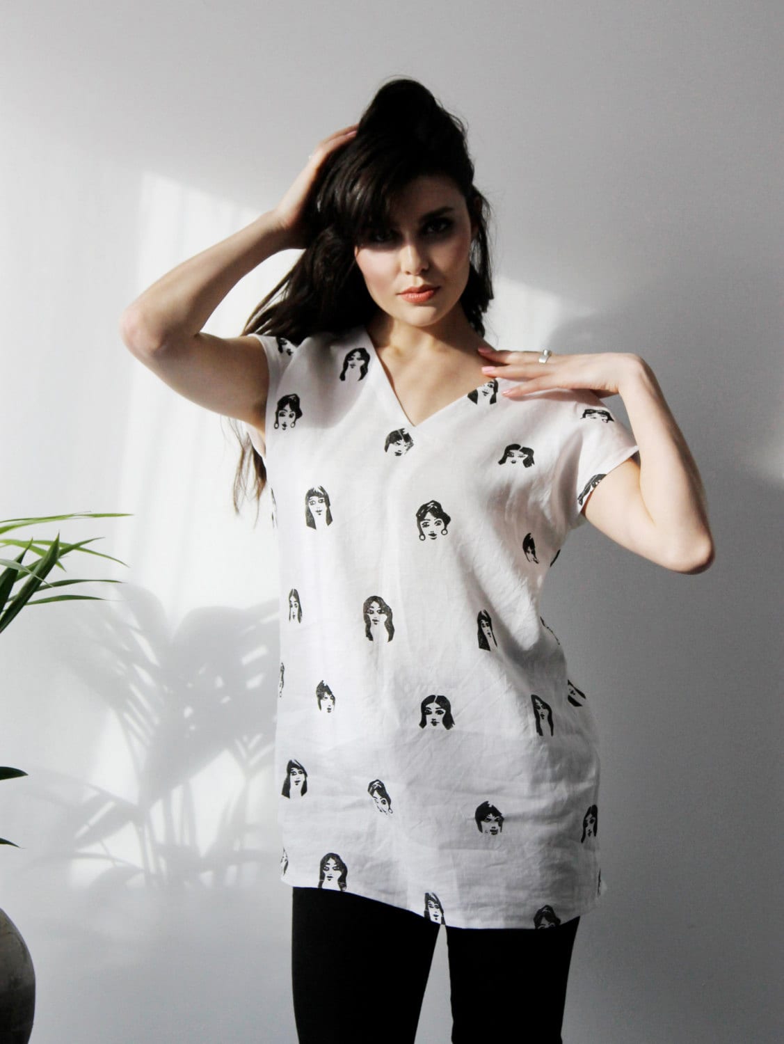Made from lovely softy textured linen-cotton with V neck at the front and deep V at back, both print and fabric will become softer and more beautiful with each wash and wear.