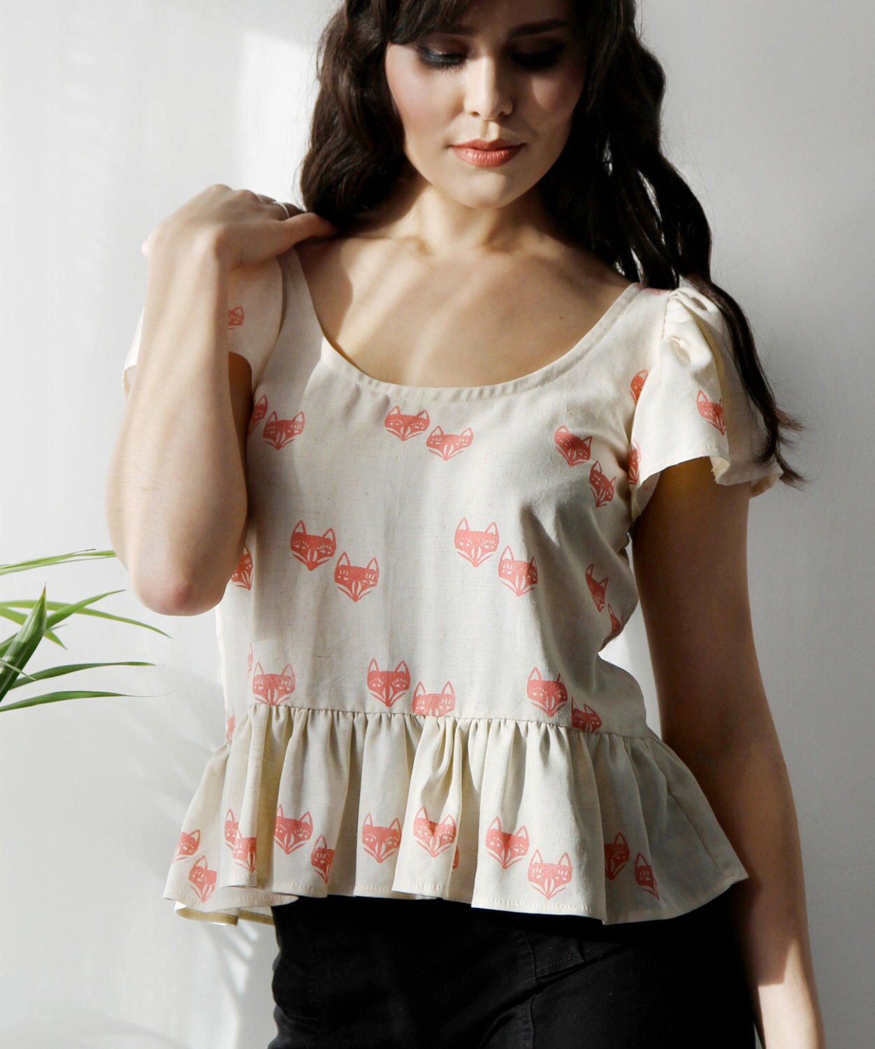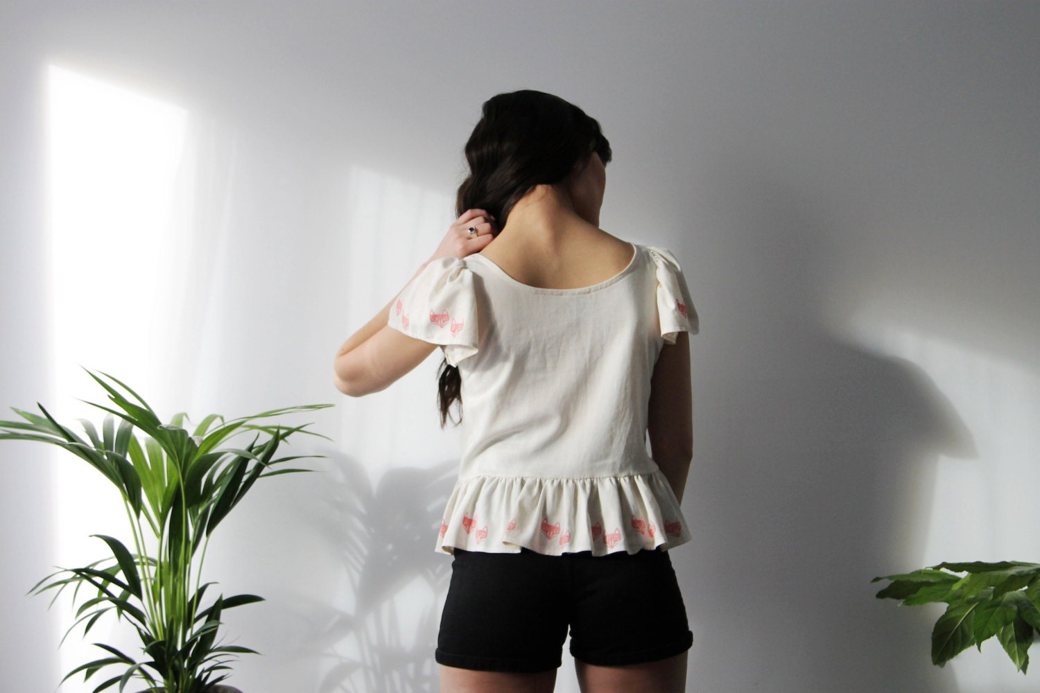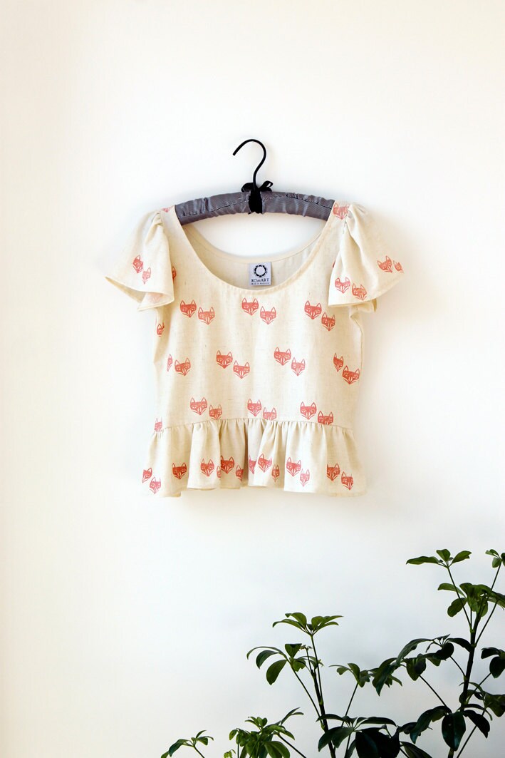 Wide scoop neck front and back. Gathered ruffly short sleeves and loose ruffled waist. Teeny tiny fox couples in a pinky dark coral/peach blush colour, are block printed on the front and on part of the back. What could be more adorable!!