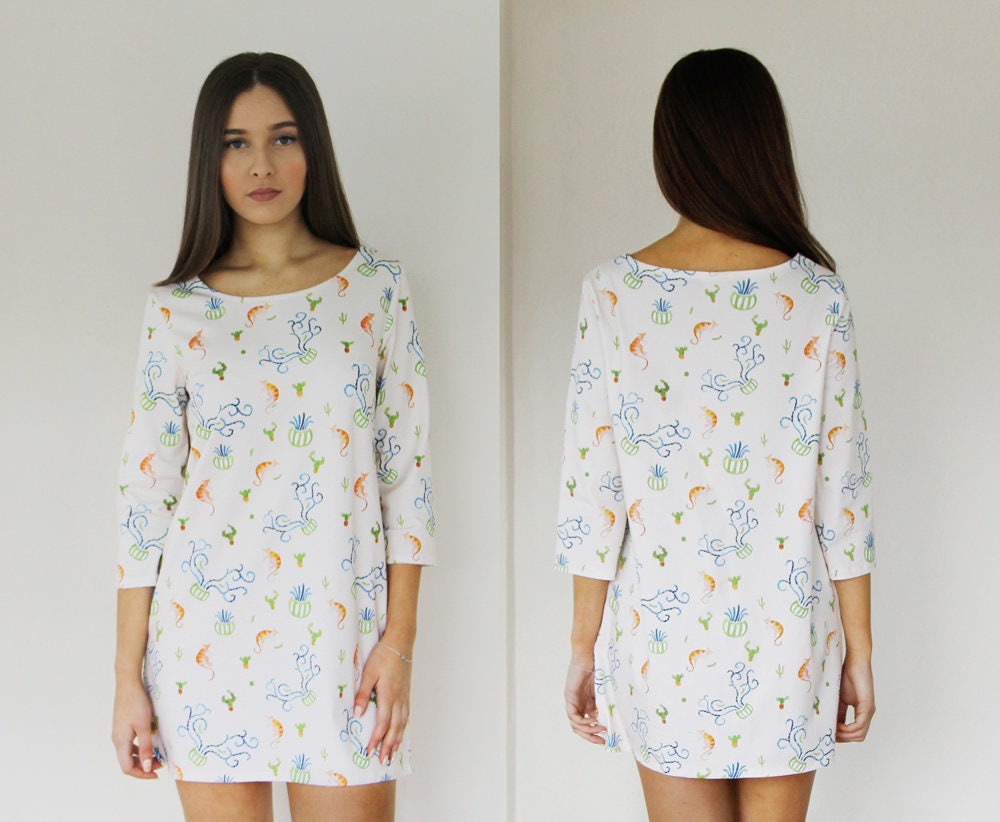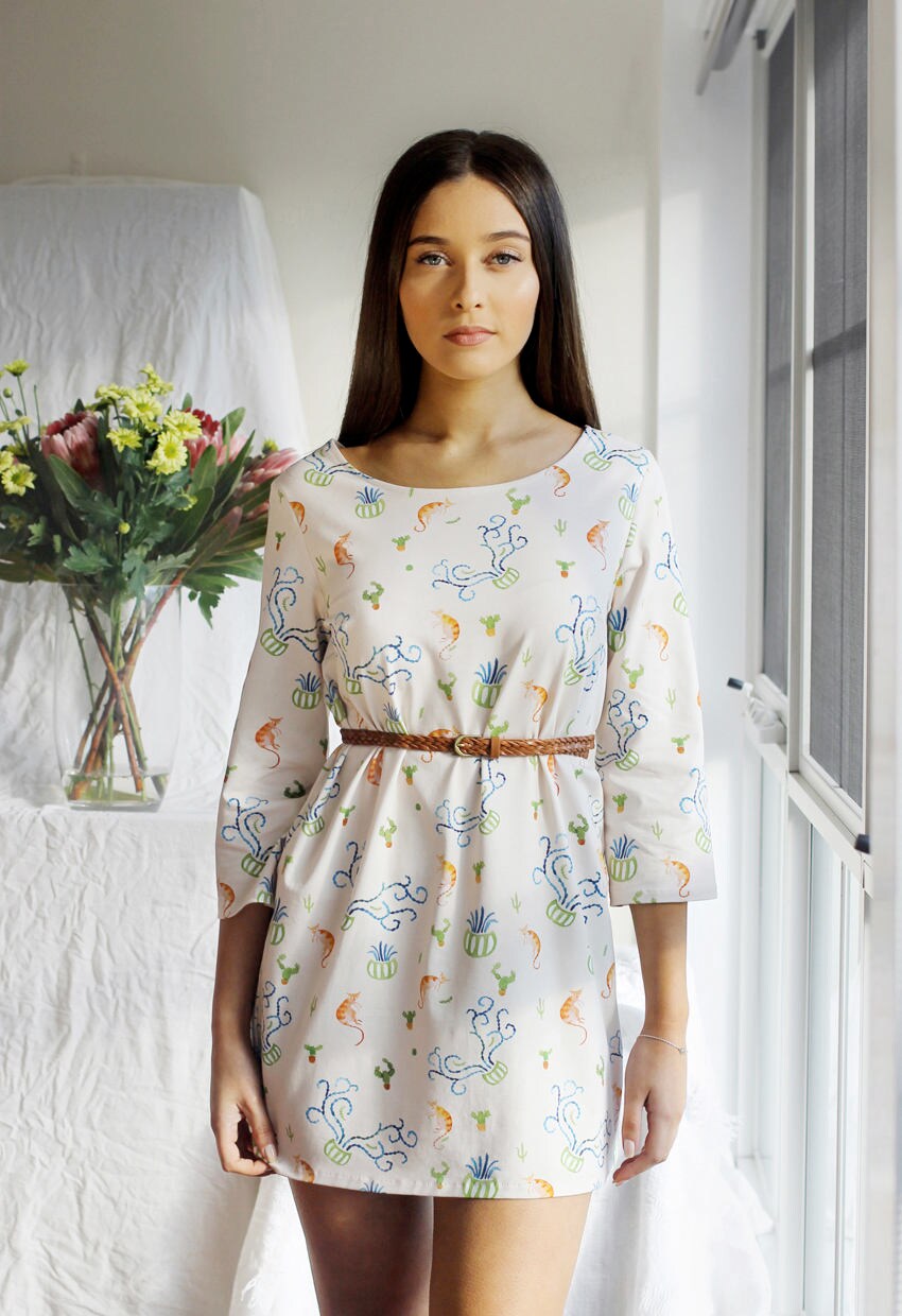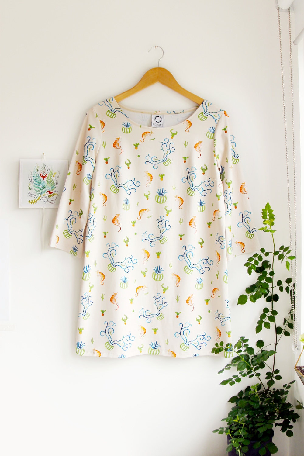 Gorgeous shift dress with three quarter length sleeves and my original "cats in the cactus garden" allover print in soft, stretchy bone/ eggshell coloured organic cotton jersey.