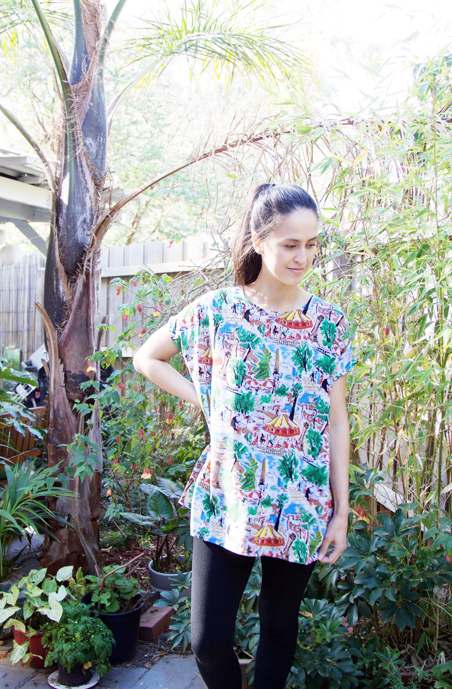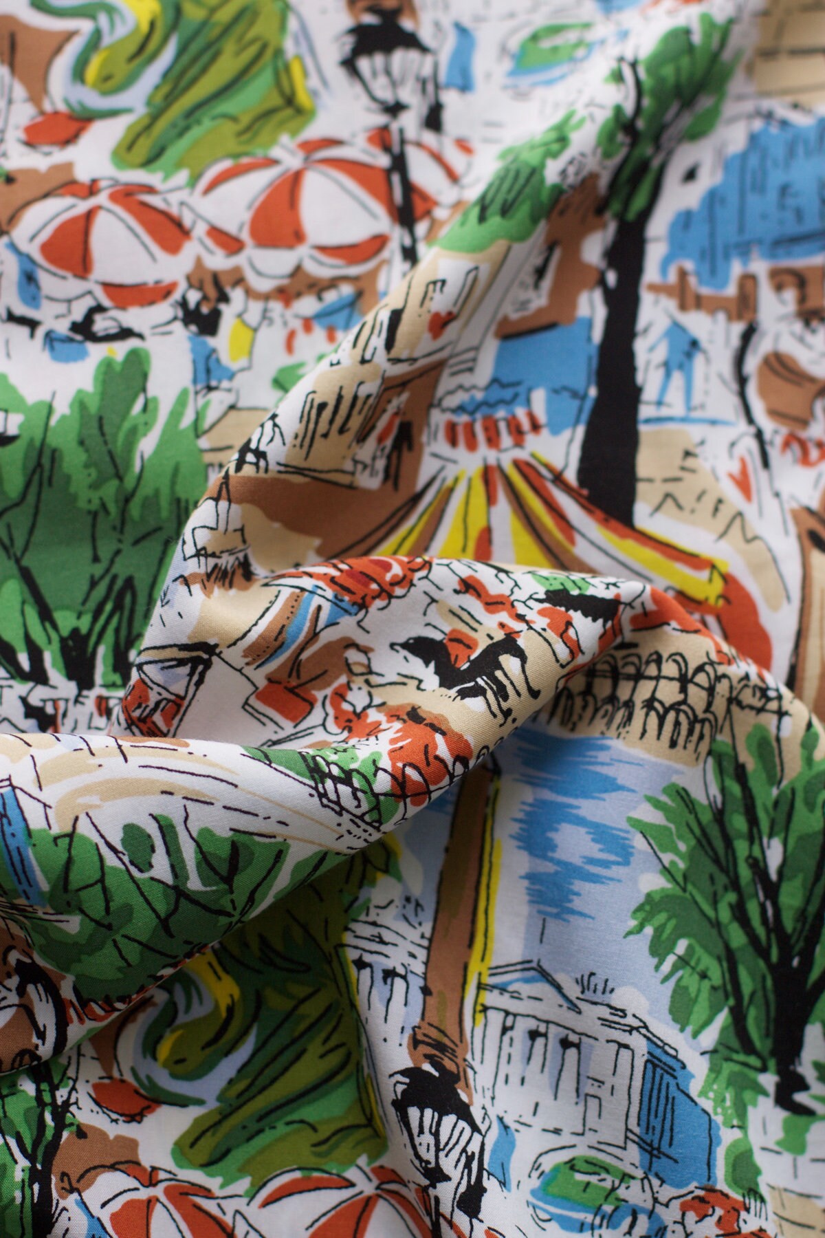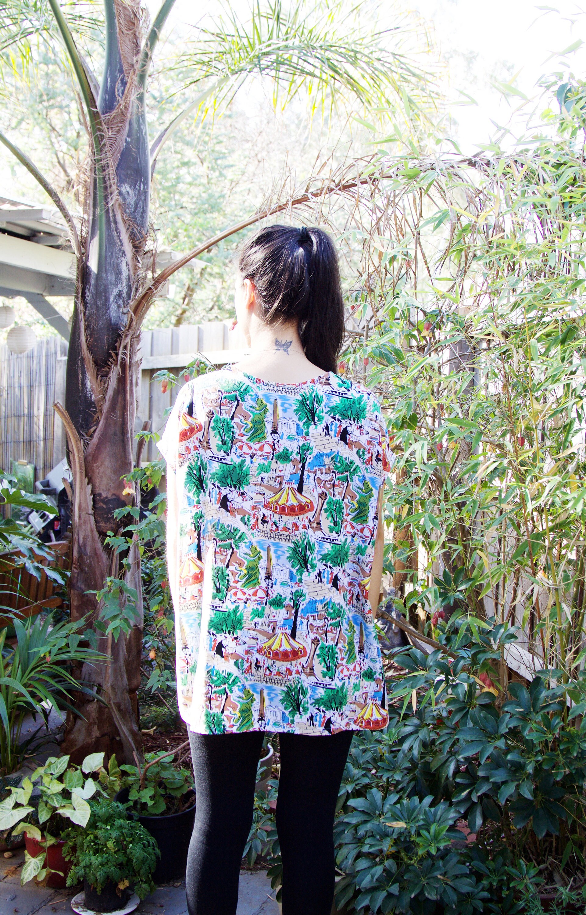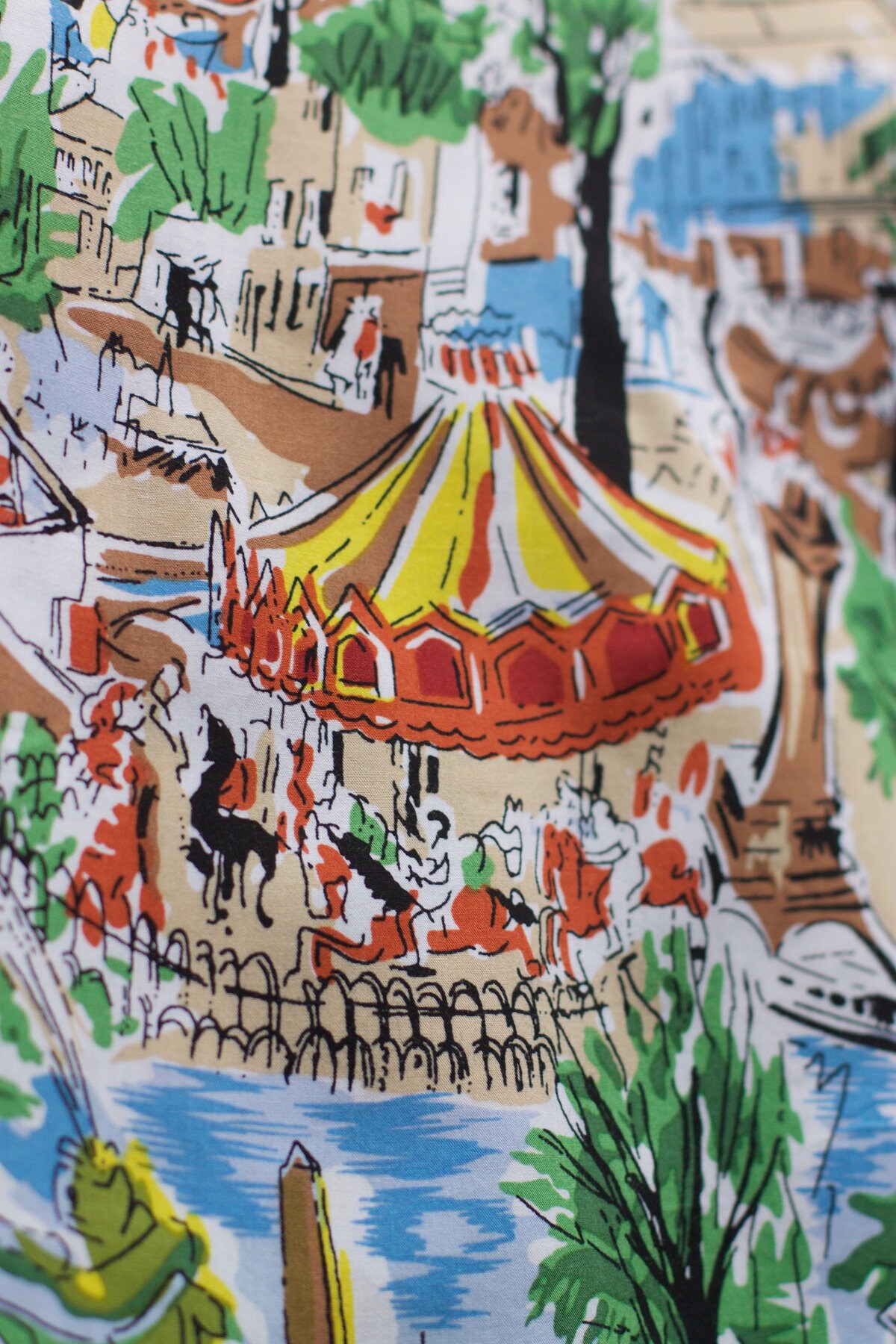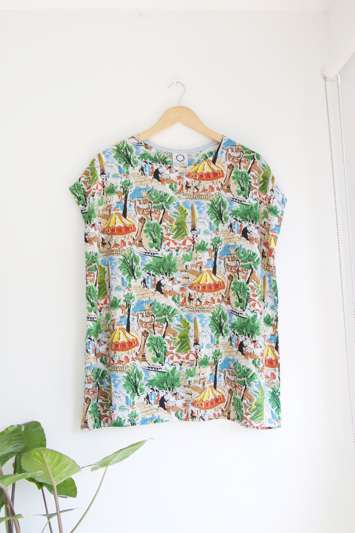 Gorgeous oversized shirt tee/trapeze top in beautiful soft willowy rayon withe a lovely painterly illustration depicting cafes, trees, rivers, merry go rounds, water fountains and inner city living. So fun and comfy looks lovely worn as is or tucked in at the front for more pizazz ;)