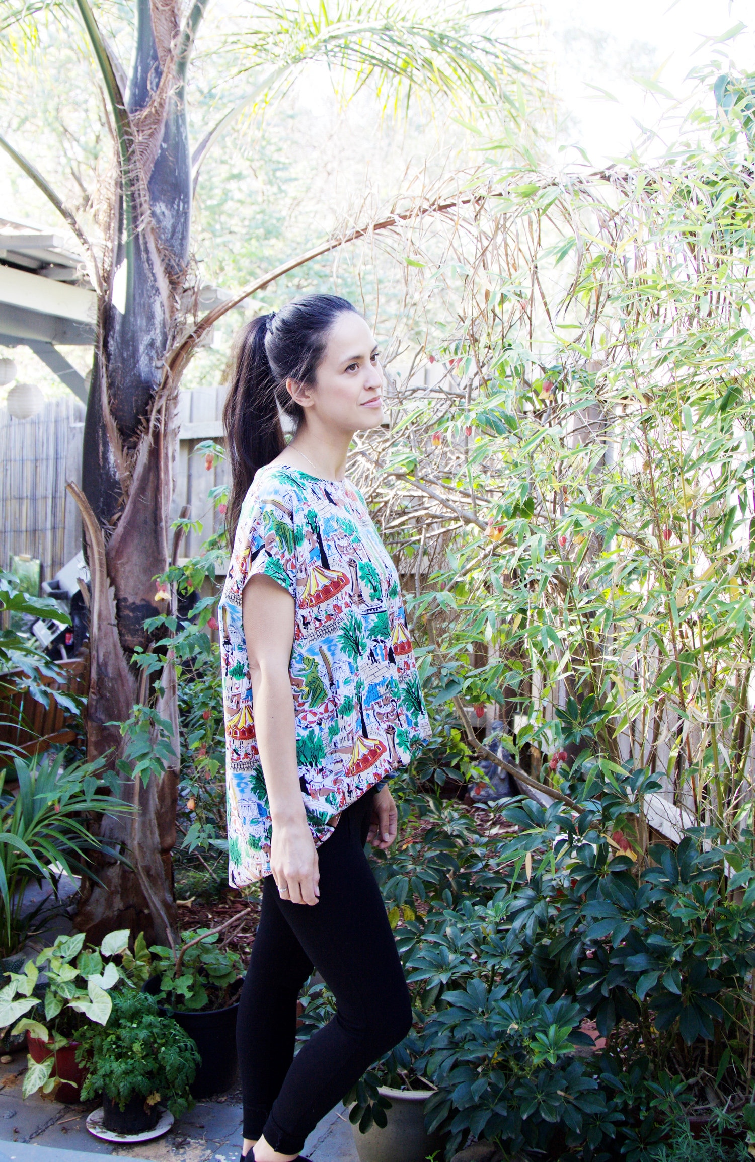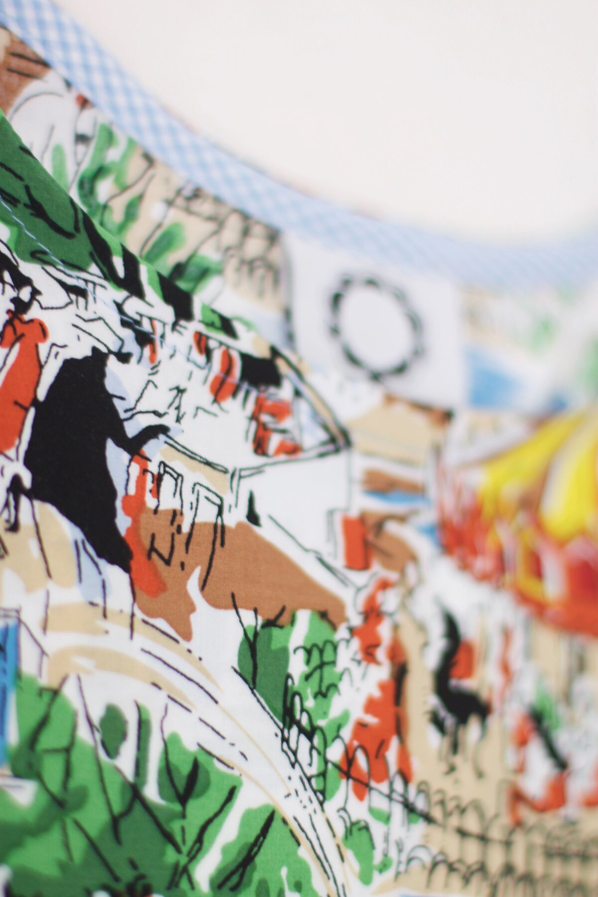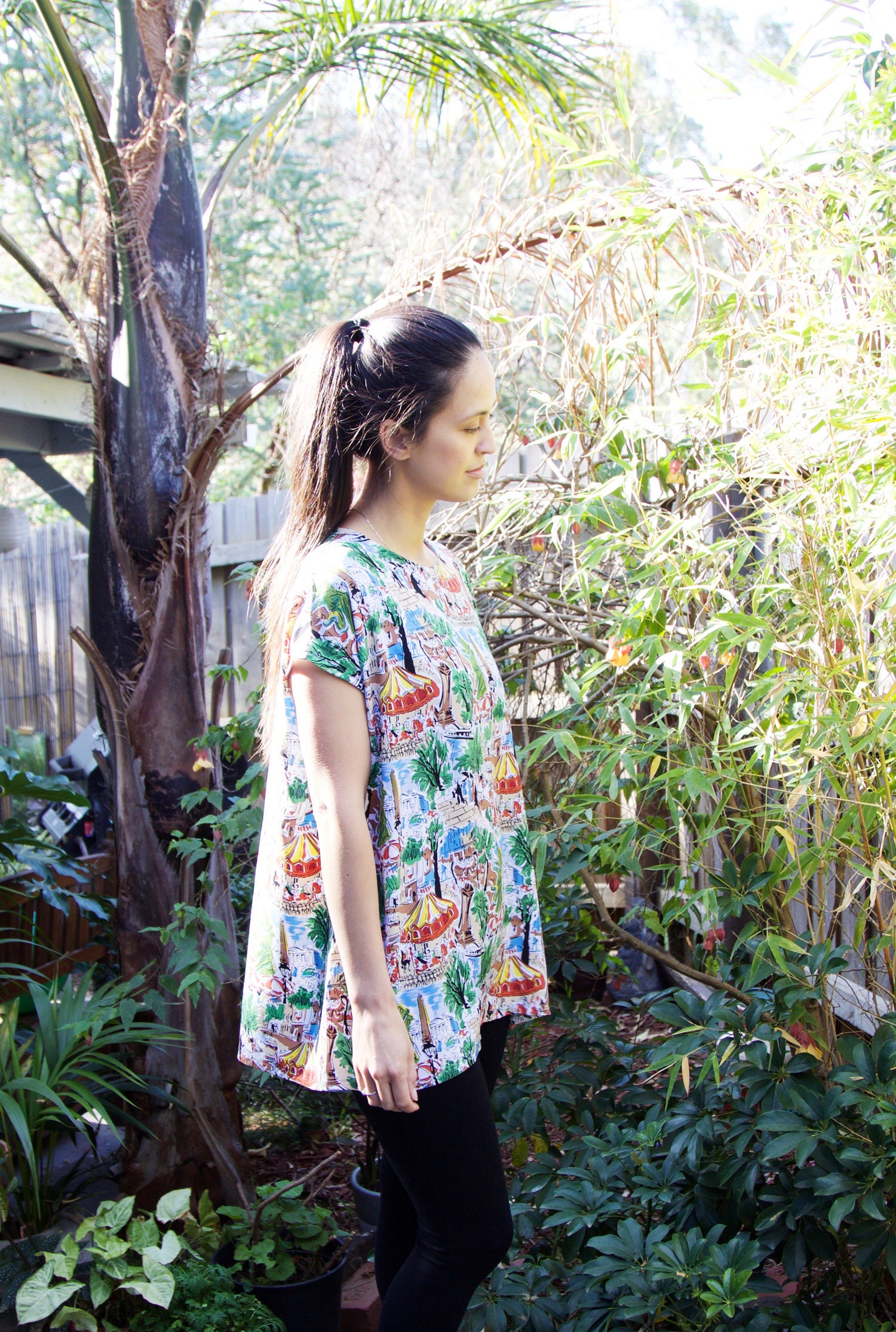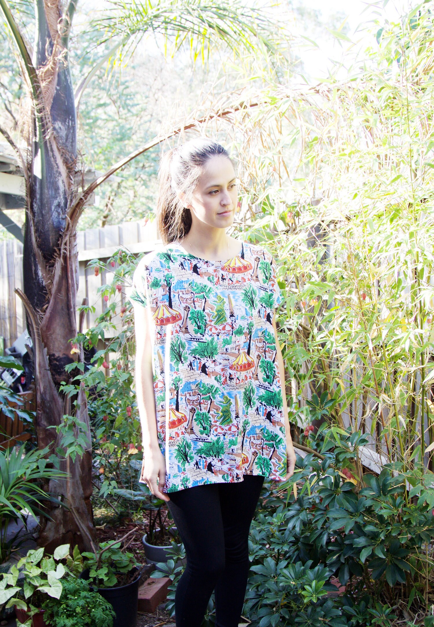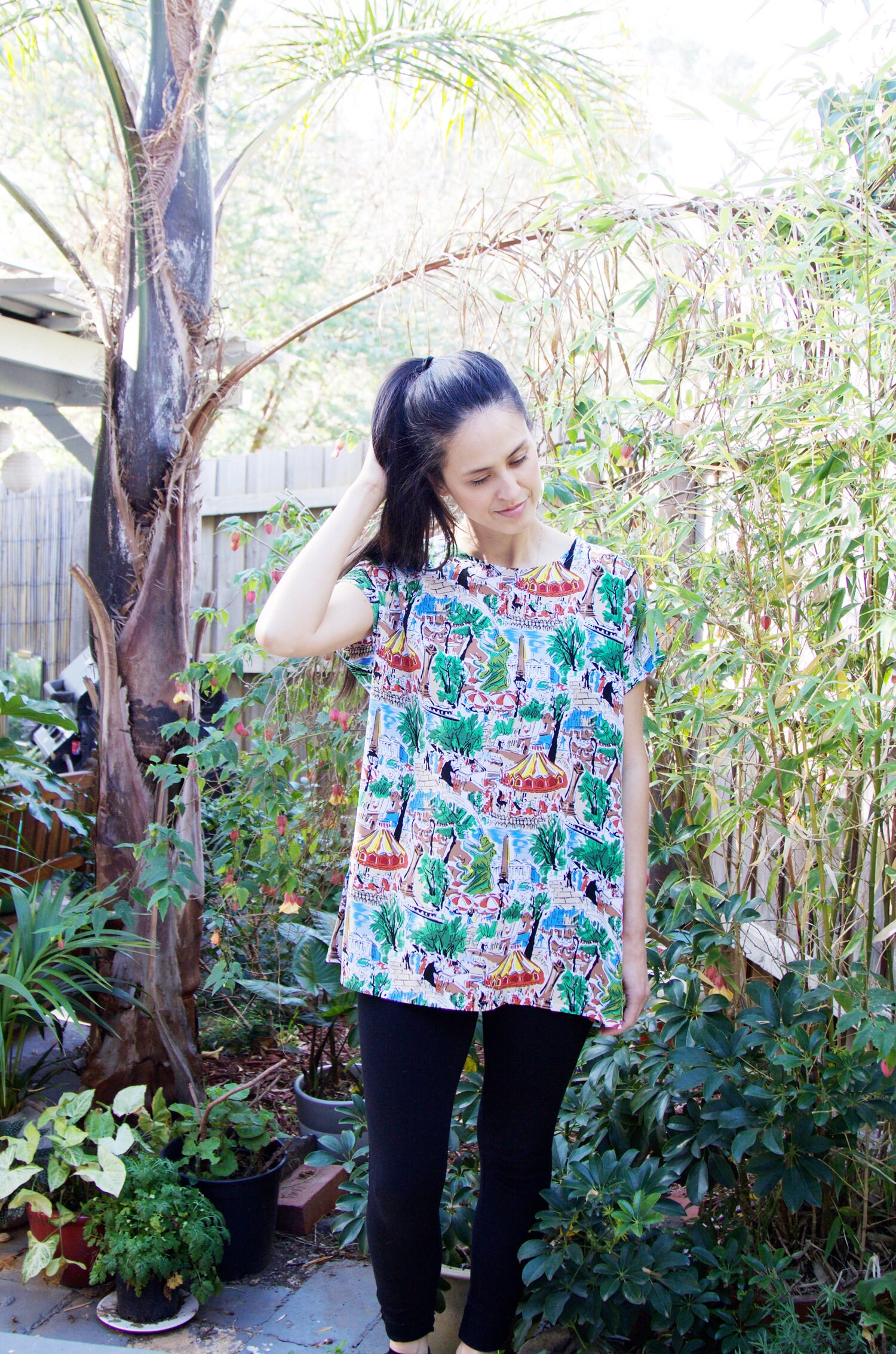 Gorgeous oversized shirt tee/trapeze top in beautiful soft willowy rayon withe a lovely painterly illustration depicting cafes, trees, rivers, merry go rounds, water fountains and inner city living. So fun and comfy looks lovely worn as is or tucked in at the front for more pizazz ;)