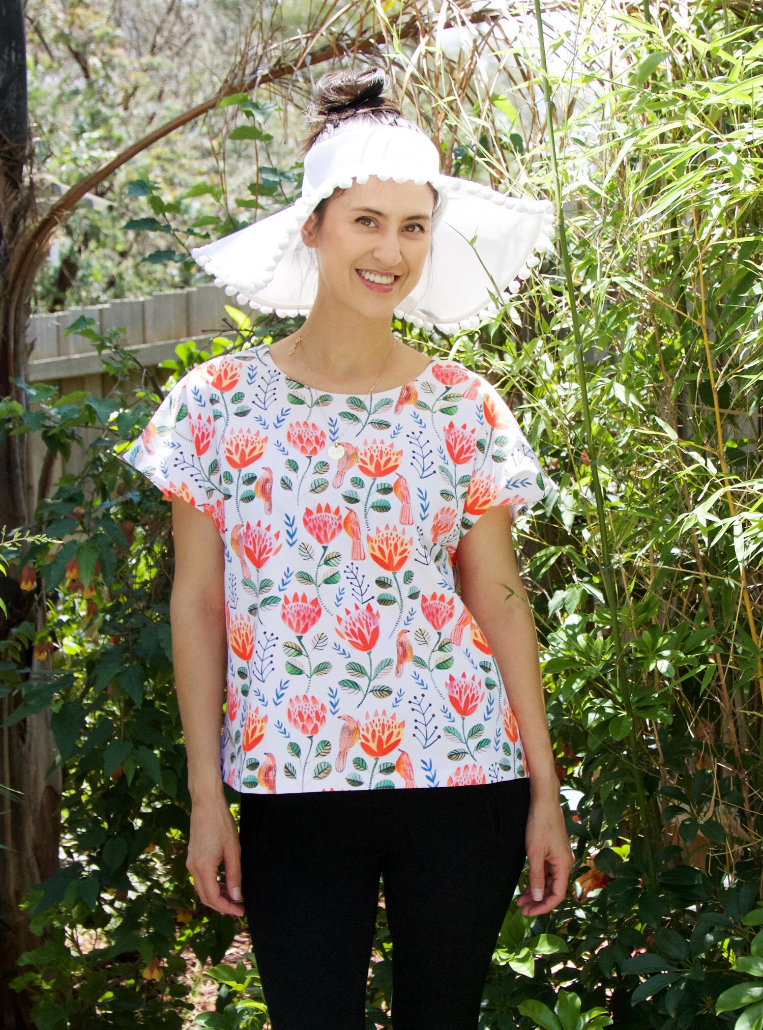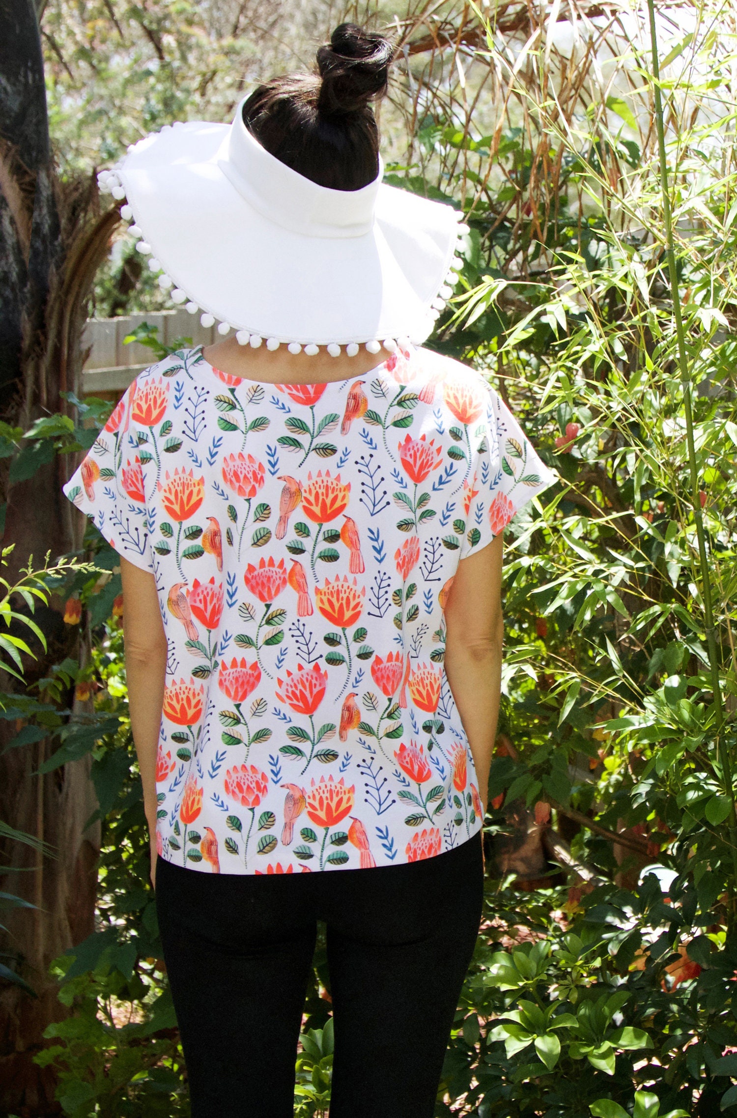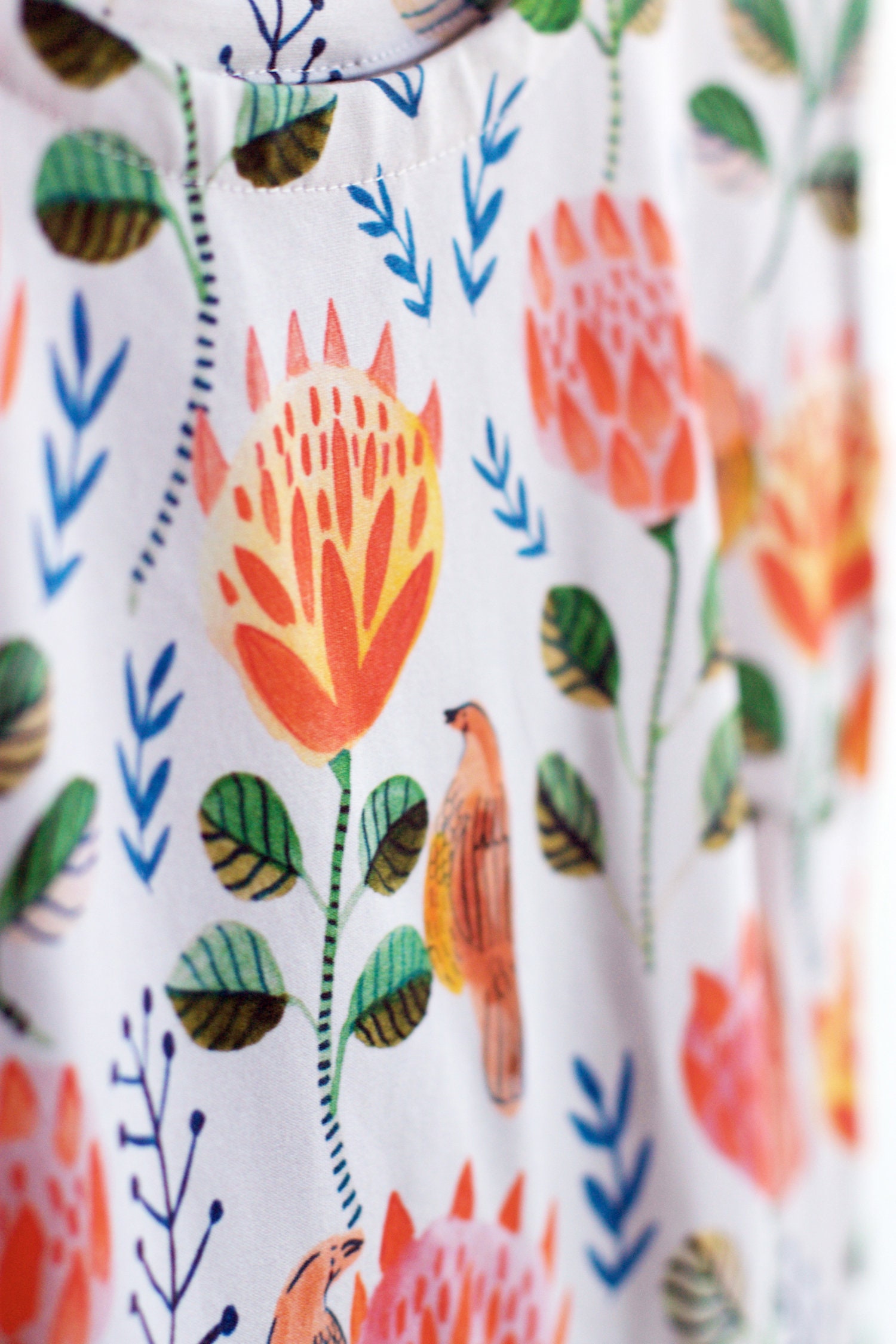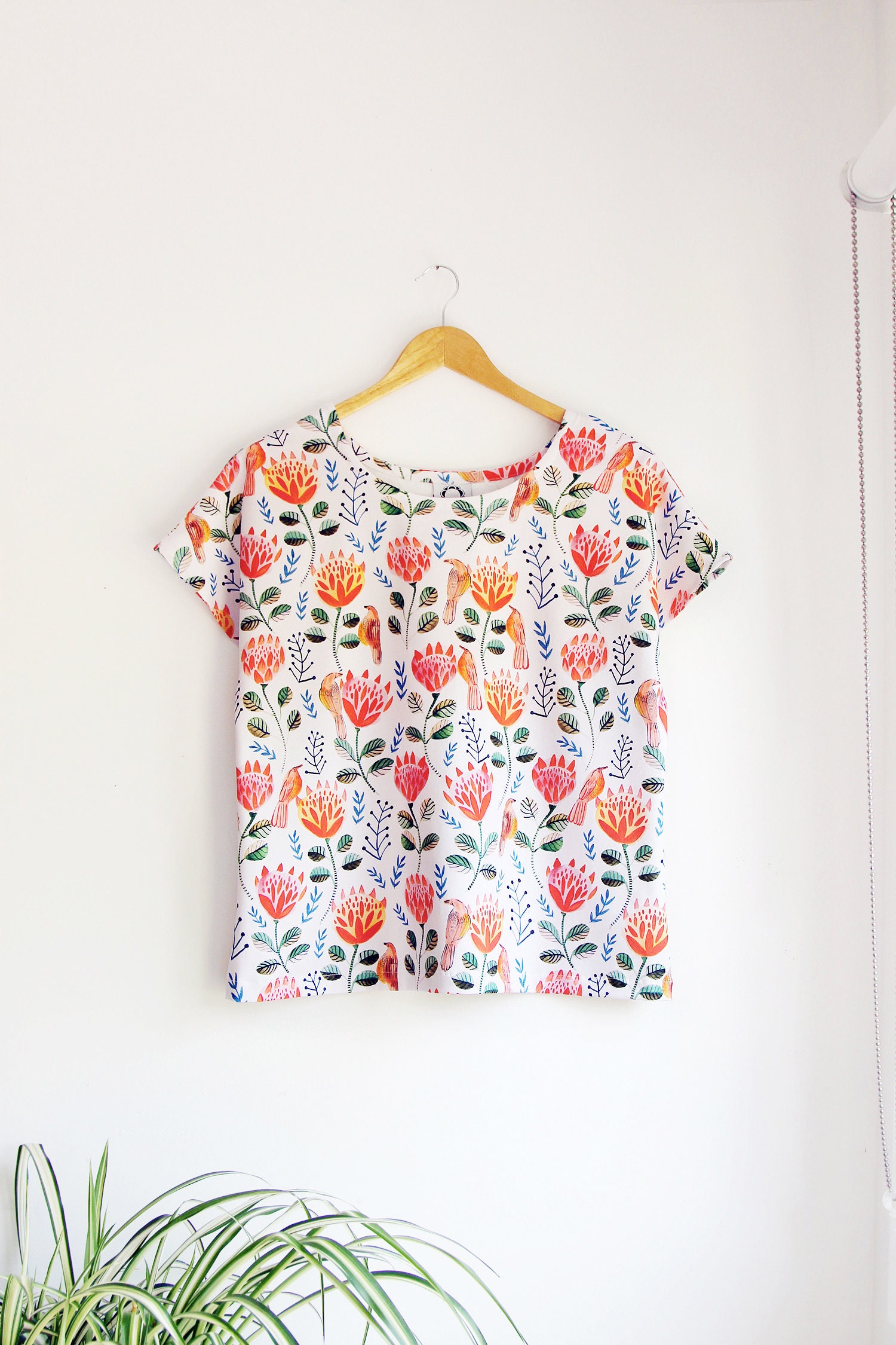 Inspired by the majestic and striking King Protea and the Australian wattle bird, this super gorgeous organic cotton jersey tee features beautiful hand painted proteas and birds in bright shades orange, coral and red in an all over folksy, floral design.
