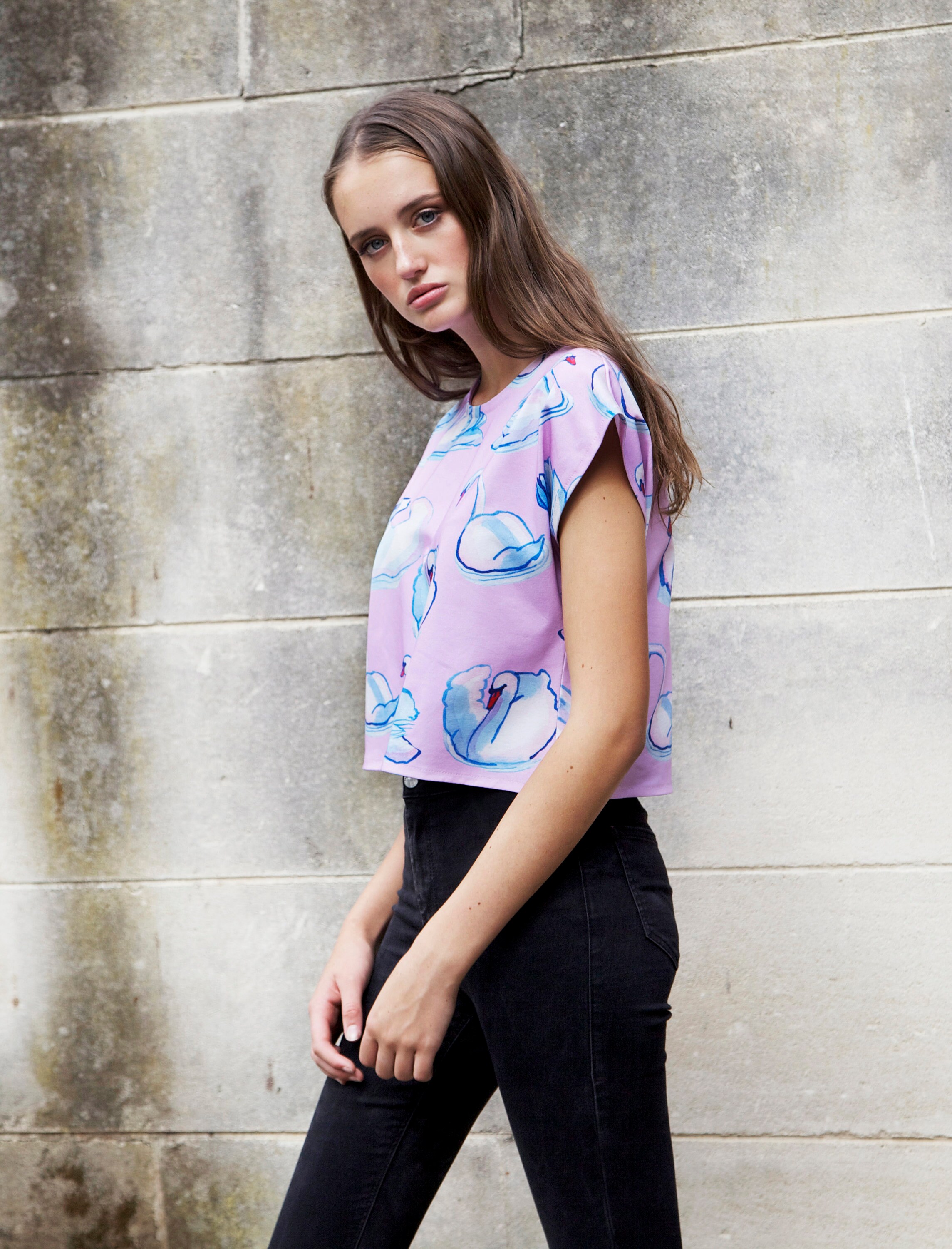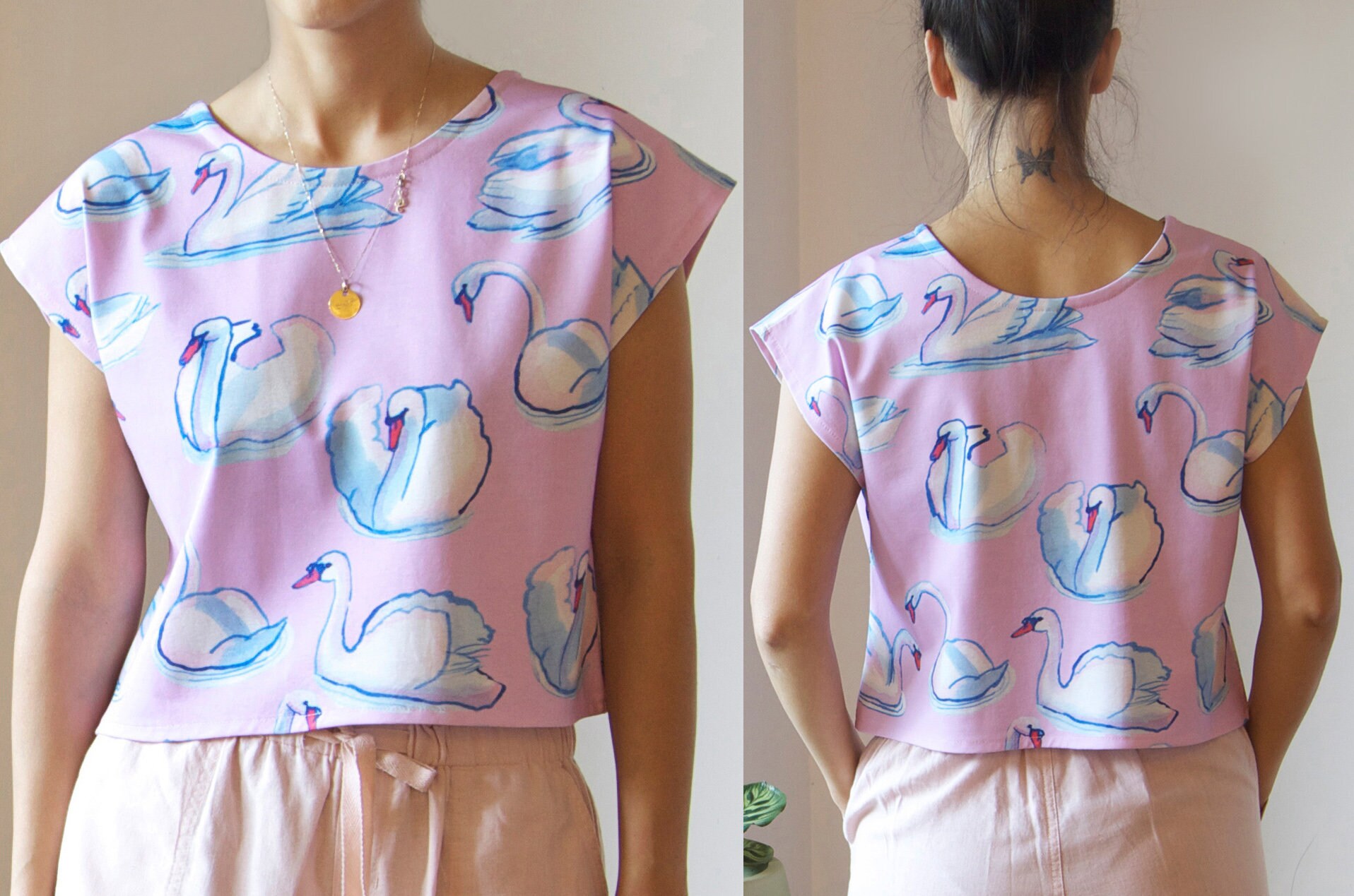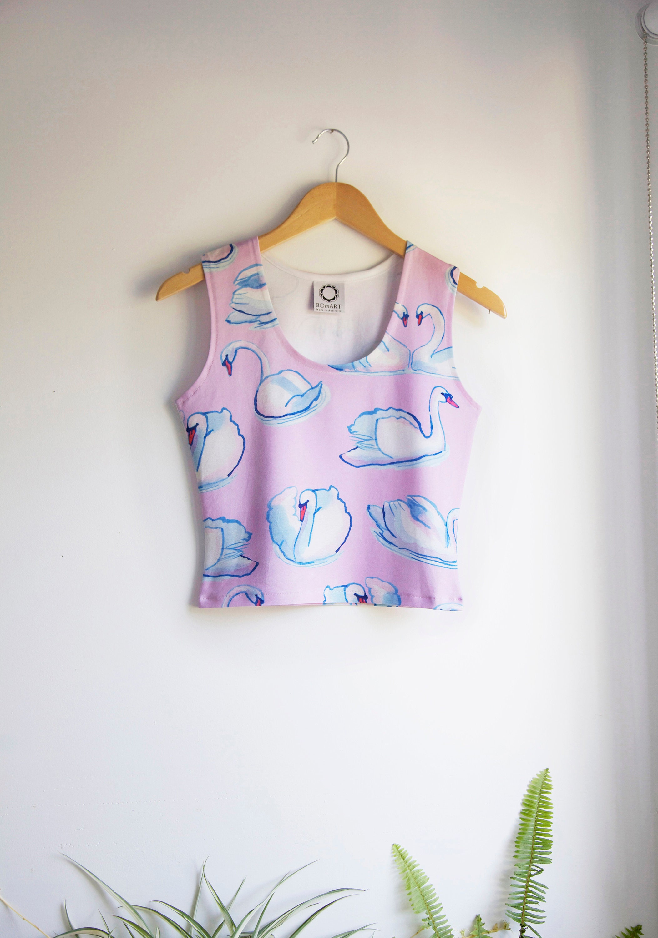Super fun 80's style boxy top or singlet top in lilac or cobalt organic cotton jersey. My own original swan illustration has been digitally printed onto the fabric in an all over design.