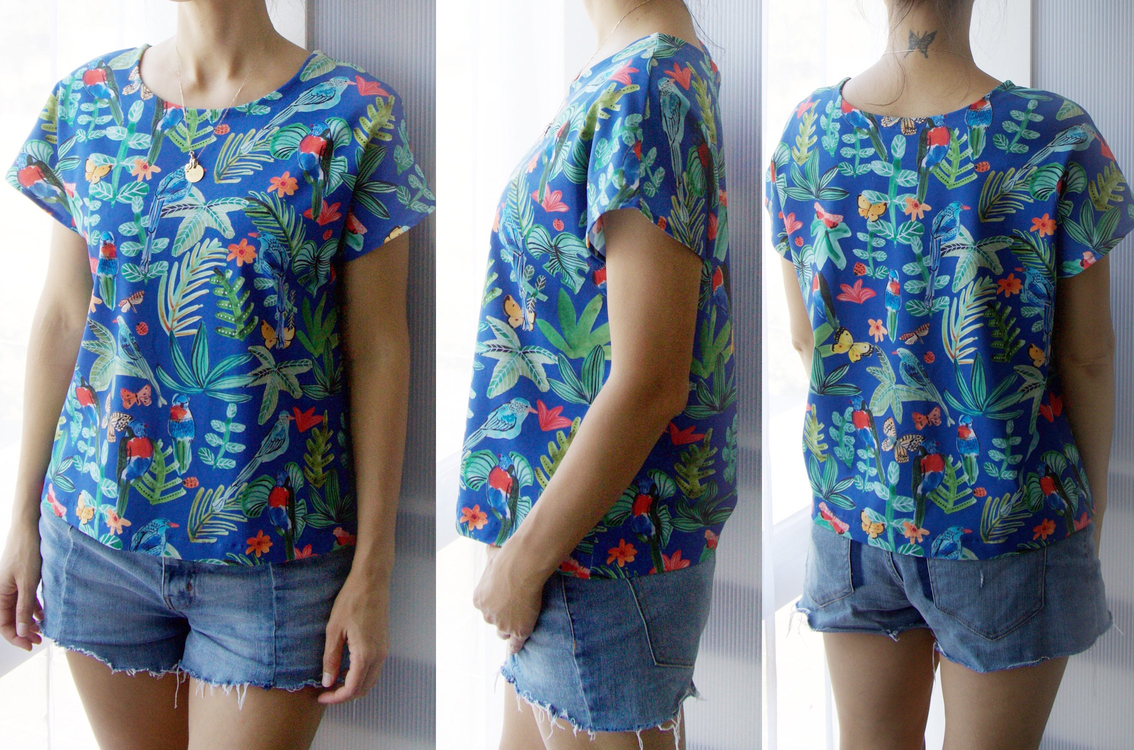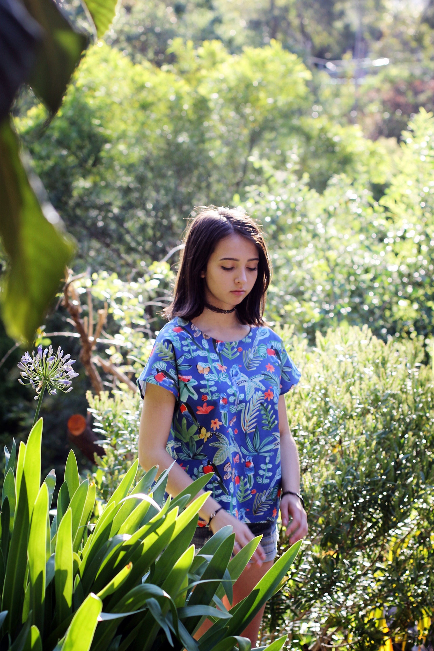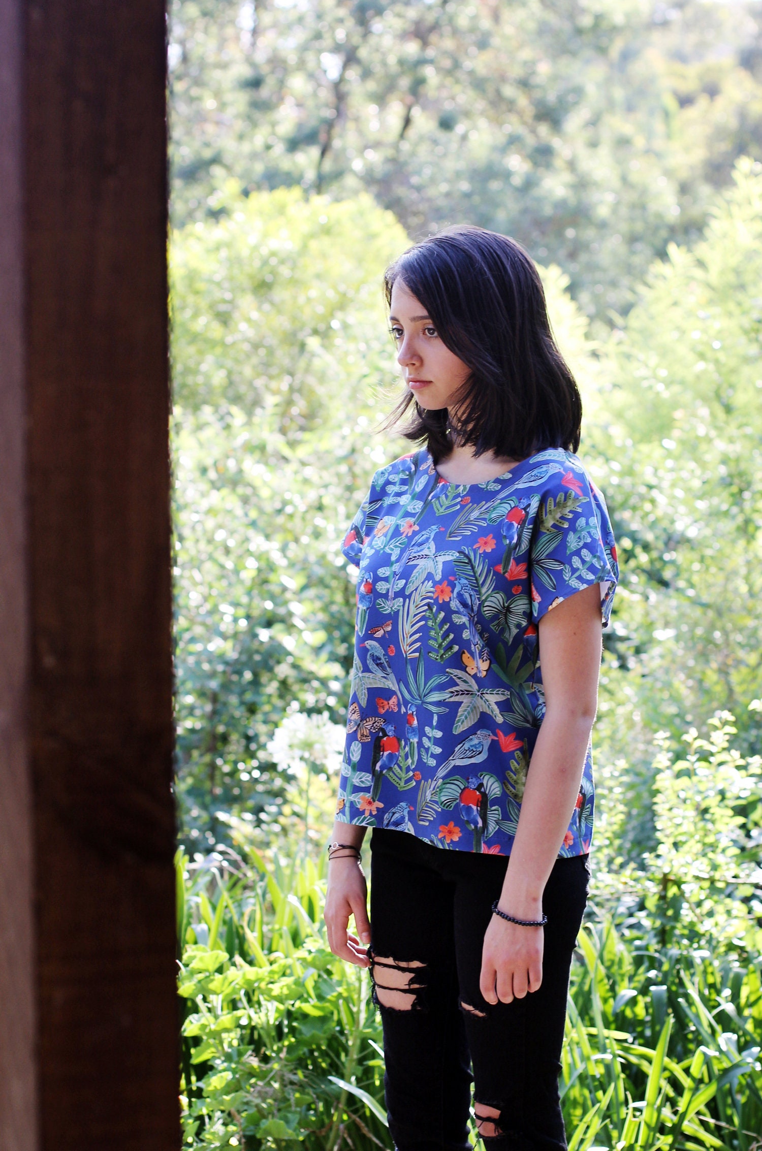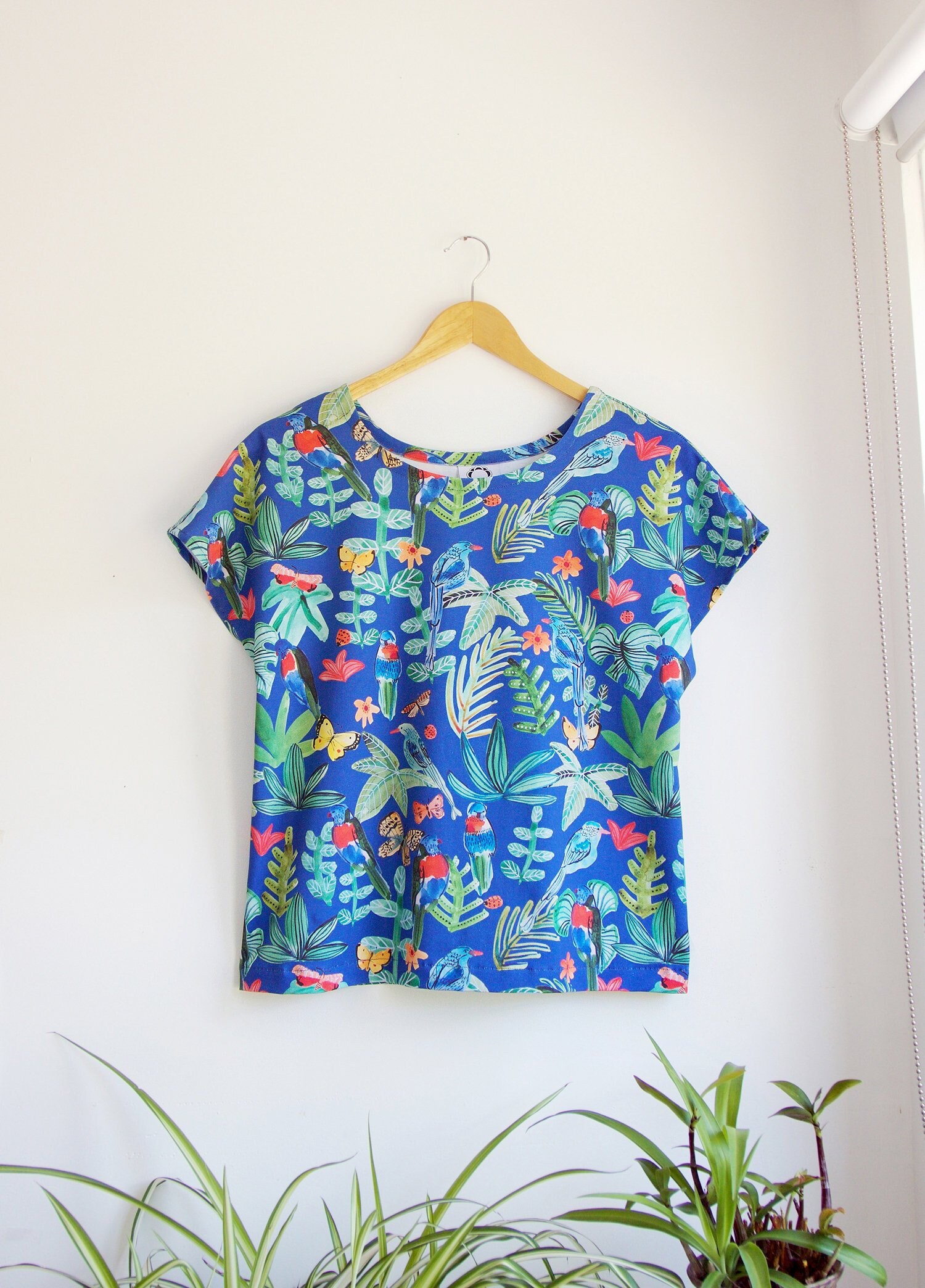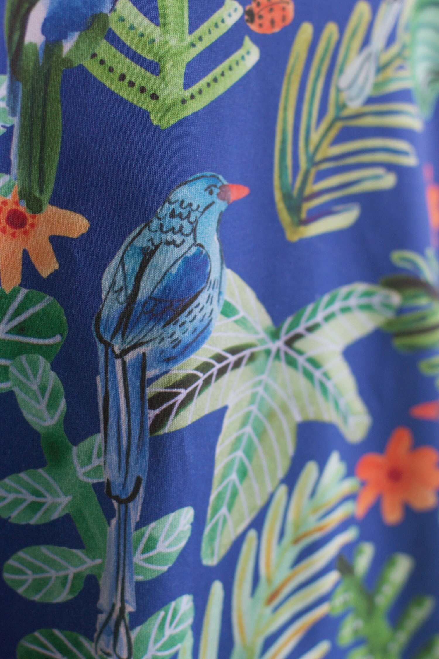Beautiful Rainforest T Shirt in Egyptian blue, black, or fuchsia. My own original rainforest illustration has been digitally printed onto the fabric in an all over floral design.