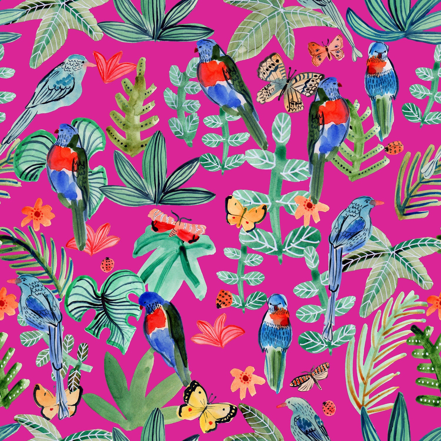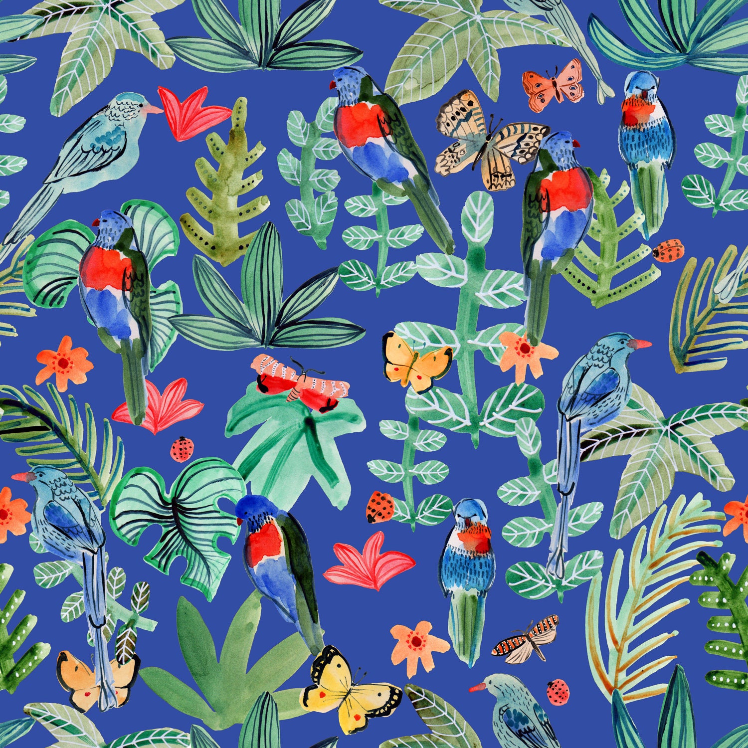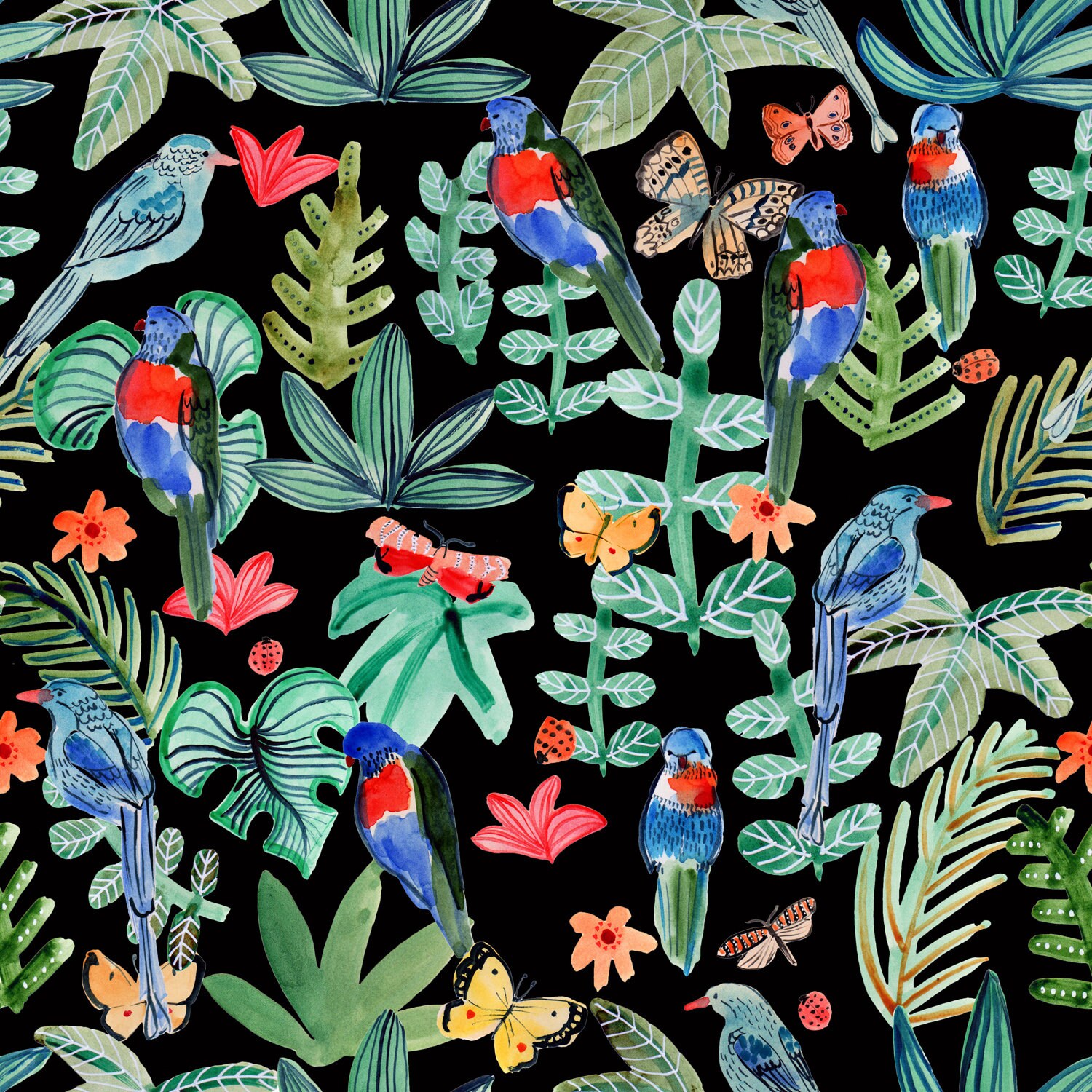 The textile design was inspired by the flora and fauna of the beautiful Australian Daintree rainforest and features lush leaves, plant life and local birds such as the rainbow lorikeet and buff breasted kingfisher. There are also colourful flowers, butterflies and lady birds hidden amongst the foliage.