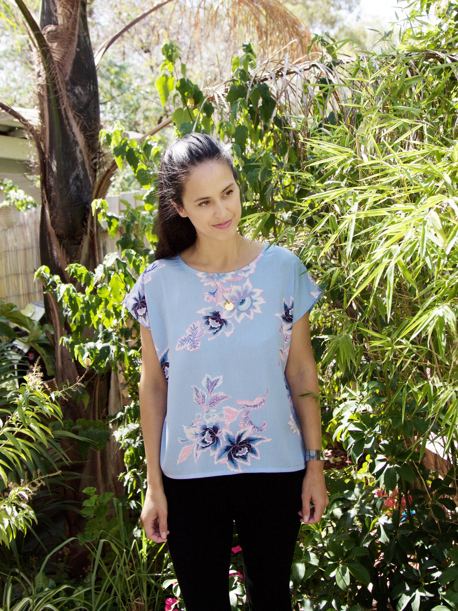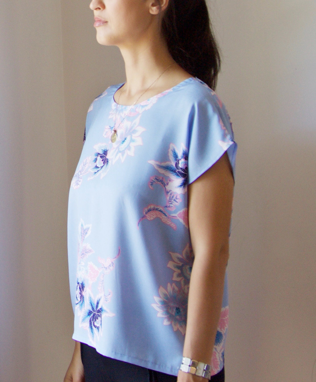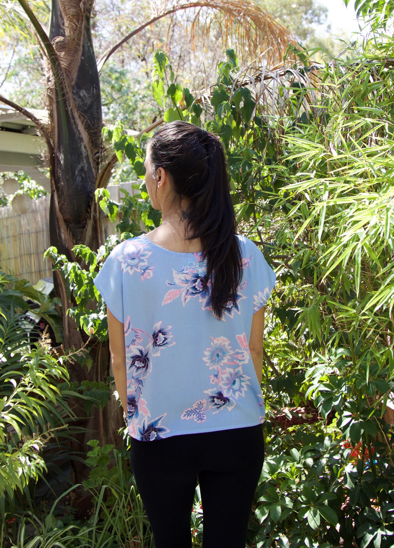 Lovely power blue rayon tee with striking batik flowers on front and back in gorgeous shades of pink and mauve. Light and flowy, great for summer and those in hot climates.