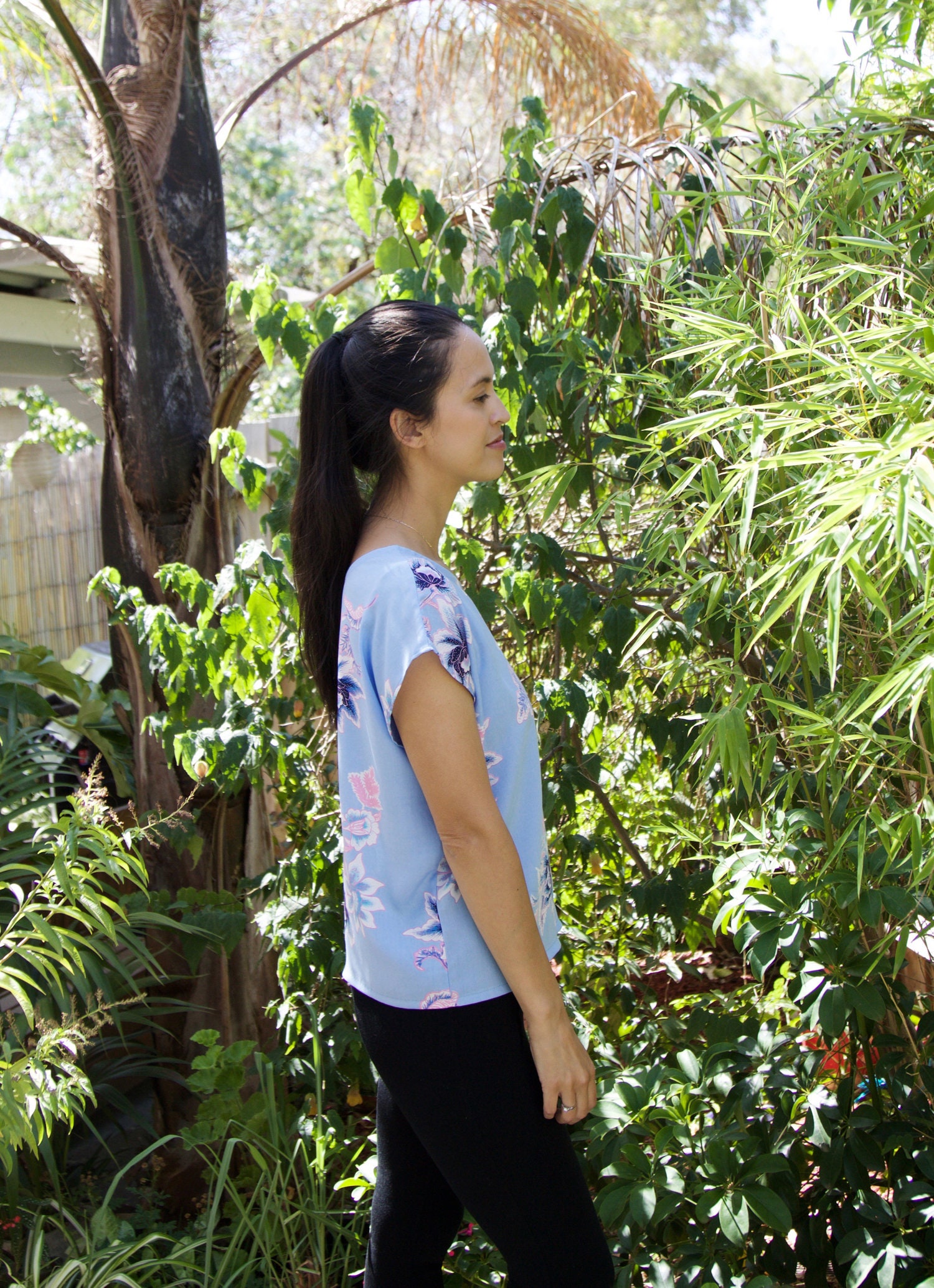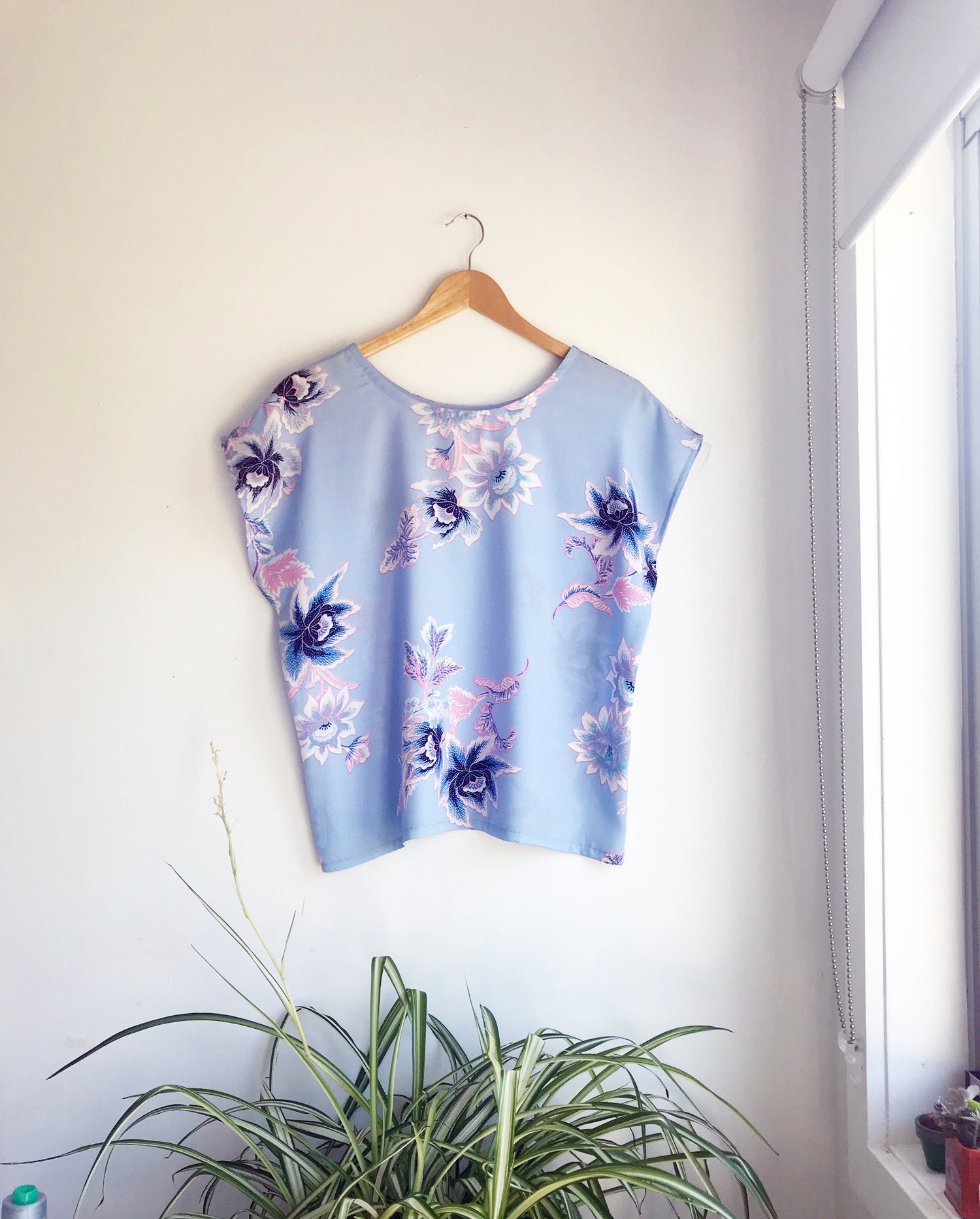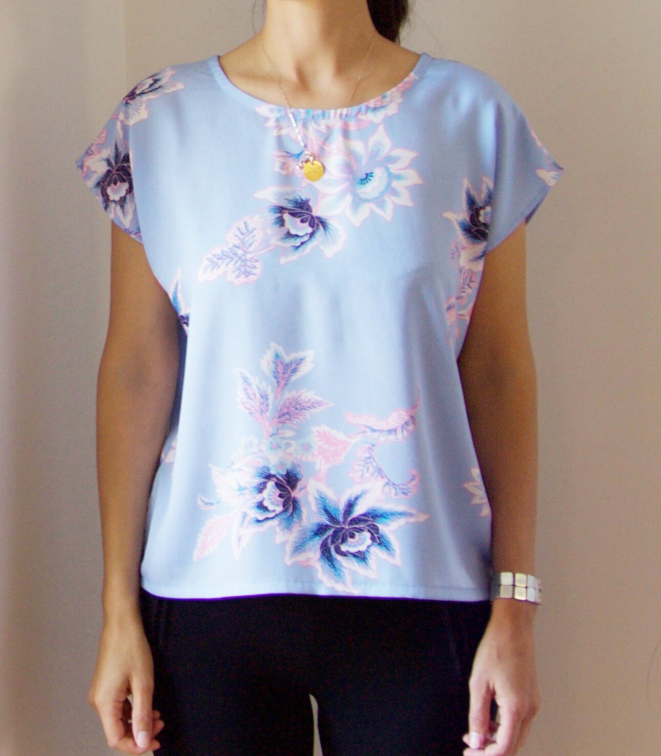 Lovely power blue rayon tee with striking batik flowers on front and back in gorgeous shades of pink and mauve. Light and flowy, great for summer and those in hot climates.